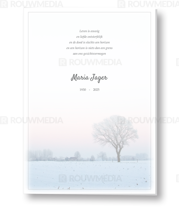 Op deze kaart met winters thema is een besneeuwde boom te zien in een Nederlands landschap