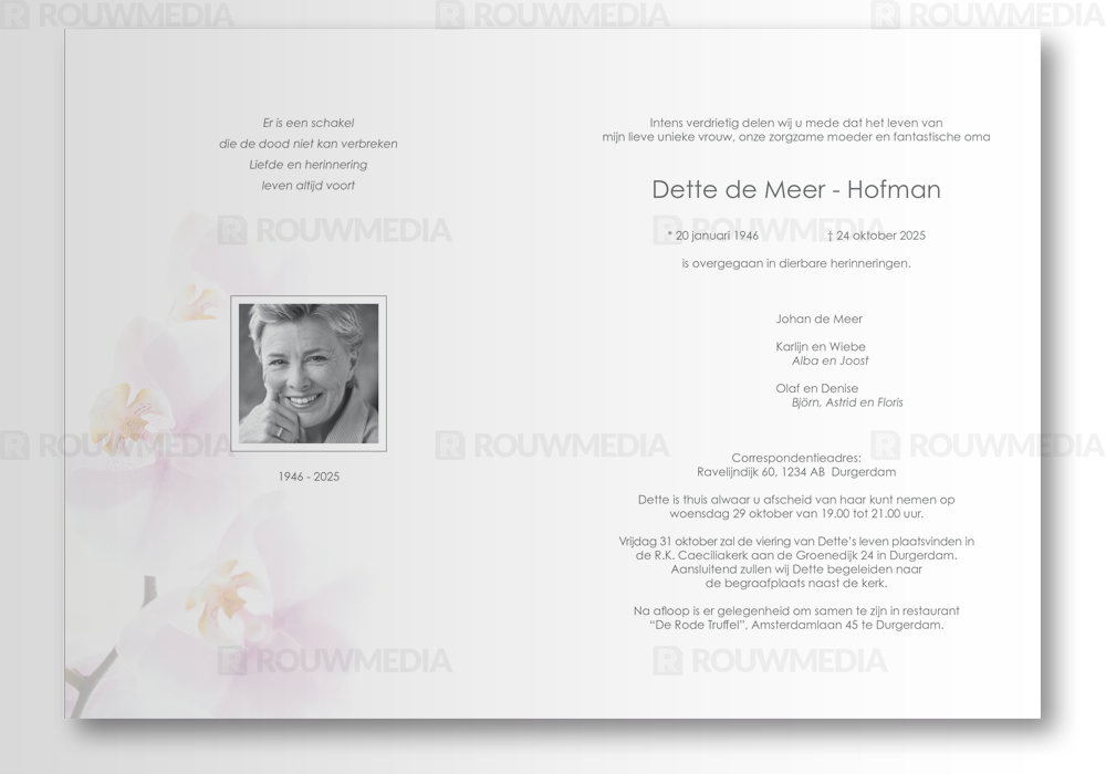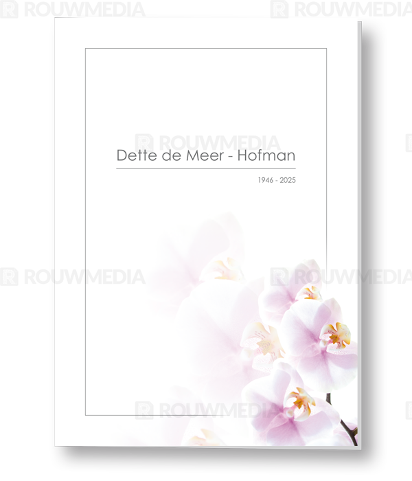 Deze vierkante rouwkaart toont in een simpele stijl hoe een afbeelding de focus kan krijgen in een kaart, maar wel de serene rust bewaart. Voor deze kaart is er gekozen voor een witte orchidee.