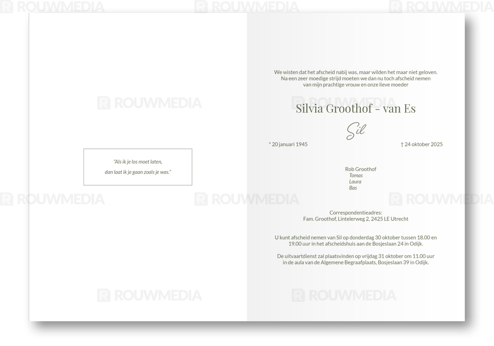 In deze rouwkaart staat de lisianthus centraal. Door de organische vormen en zachte kleuren krijgt de kaart een rustige uitstraling.