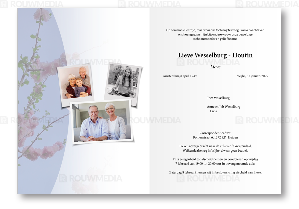 Rouwkaart met als thema Voorjaar biedt de mogelijkheid om eigen portret/afbeelding weer te geven in de stijl van de virtuele rouwkaart Voorjaar (E3001). Dit product is zowel in combinatie met de virtuele rouwkaart te bestellen als afzonderlijk. Aan de binnenzijde is het mogelijk om meerdere afbeeldingen terug te laten komen.