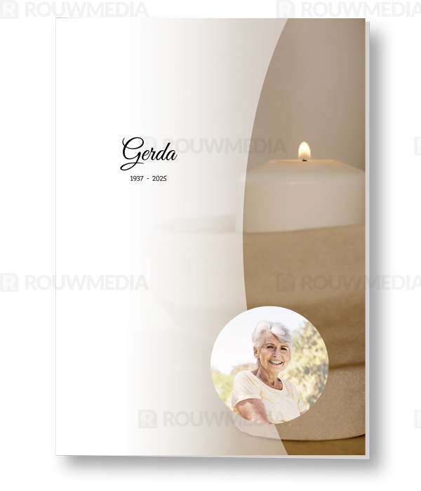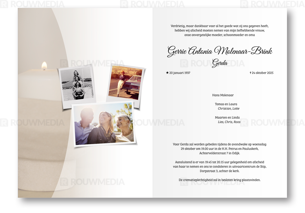 Rouwkaart met als thema Ambiance biedt de mogelijkheid om eigen portret/afbeelding weer te geven in de stijl van de virtuele rouwkaart Ambiance (E3005). Dit product is zowel in combinatie met de virtuele rouwkaart te bestellen als afzonderlijk. Aan de binnenzijde is het mogelijk om meerdere afbeeldingen terug te laten komen.