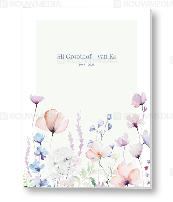 Deze staande rouwkaart toont enkele veldbloemen met de kleur groen erin verwerkt.
