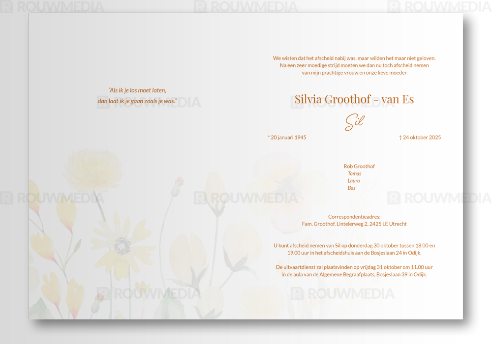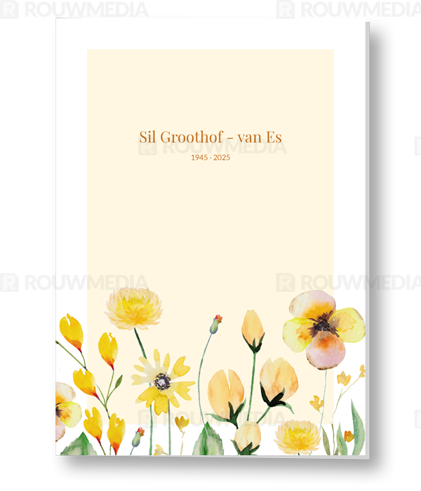 Deze staande rouwkaart toont enkele veldbloemen met de kleur geel erin verwerkt.