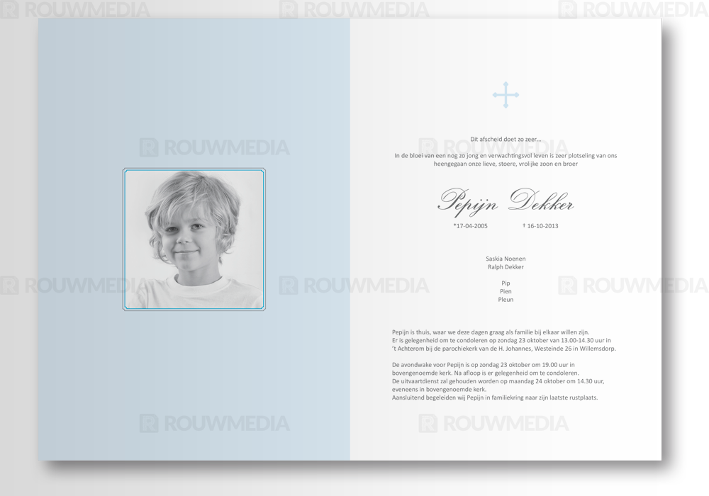 Op deze rouwkaart met blauwe rand is een klassiek grijs kader en een kruisje verwerkt. Aan de binnenzijde is ruimte voor een eigen foto.