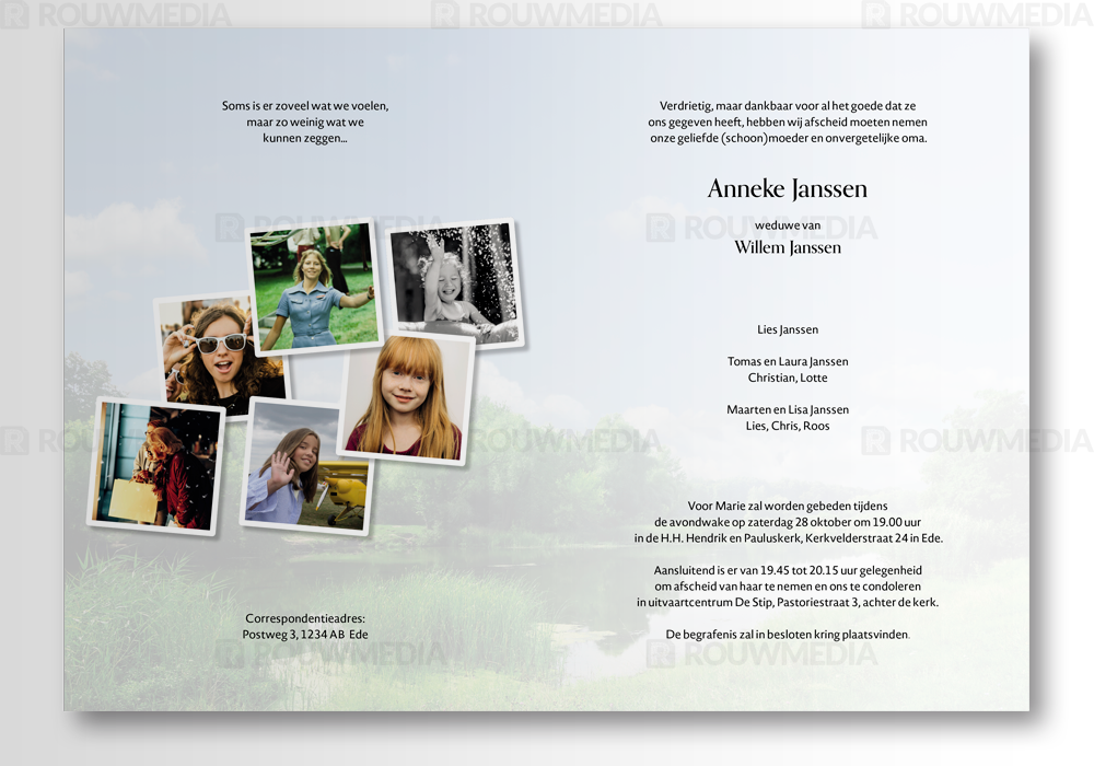 Rouwkaart met als thema Bomen biedt de mogelijkheid om eigen portret/afbeelding weer te geven in de stijl van de virtuele rouwkaart Bomen (E3016). Dit product is zowel in combinatie met de virtuele rouwkaart te bestellen als afzonderlijk. Aan de binnenzijde is het mogelijk om meerdere afbeeldingen terug te laten komen.
