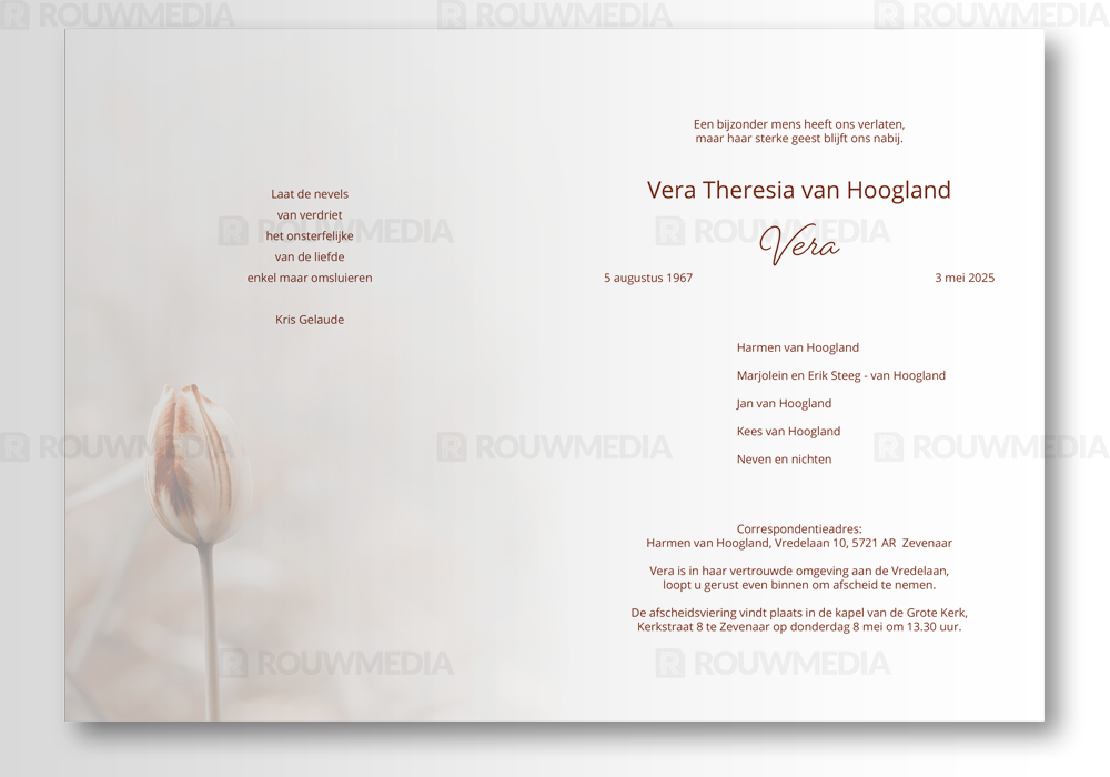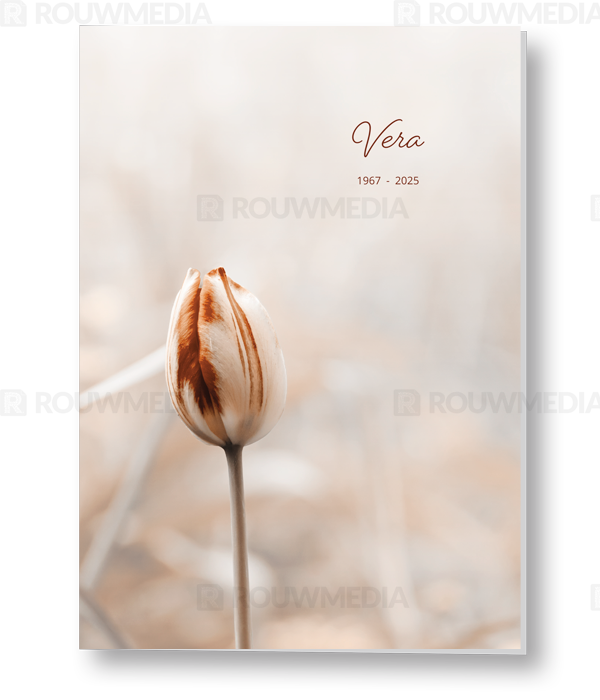 Deze staande rouwkaart toont een dichte roos in de natuur
