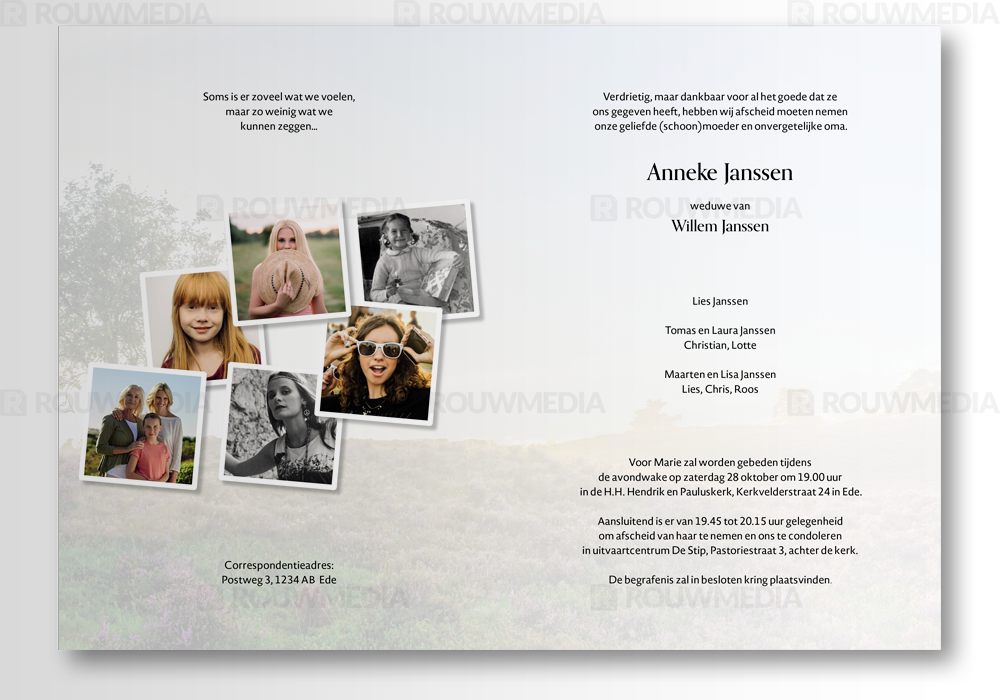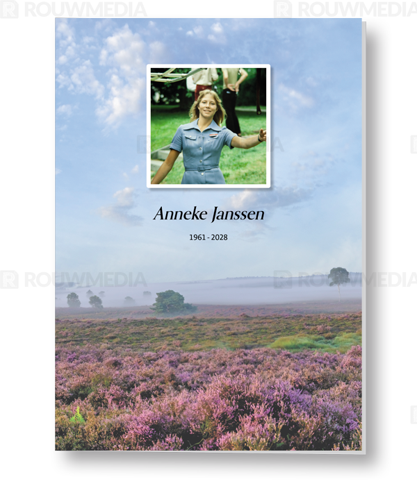 Rouwkaart met als thema Heide biedt de mogelijkheid om eigen portret/afbeelding weer te geven in de stijl van de virtuele rouwkaart Heide (E3015). Dit product is zowel in combinatie met de virtuele rouwkaart te bestellen als afzonderlijk. Aan de binnenzijde is het mogelijk om meerdere afbeeldingen terug te laten komen.