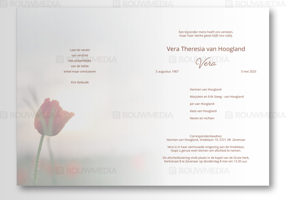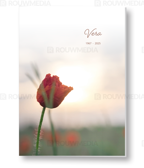 Deze staande rouwkaart toont een klaproos in een grasveld.