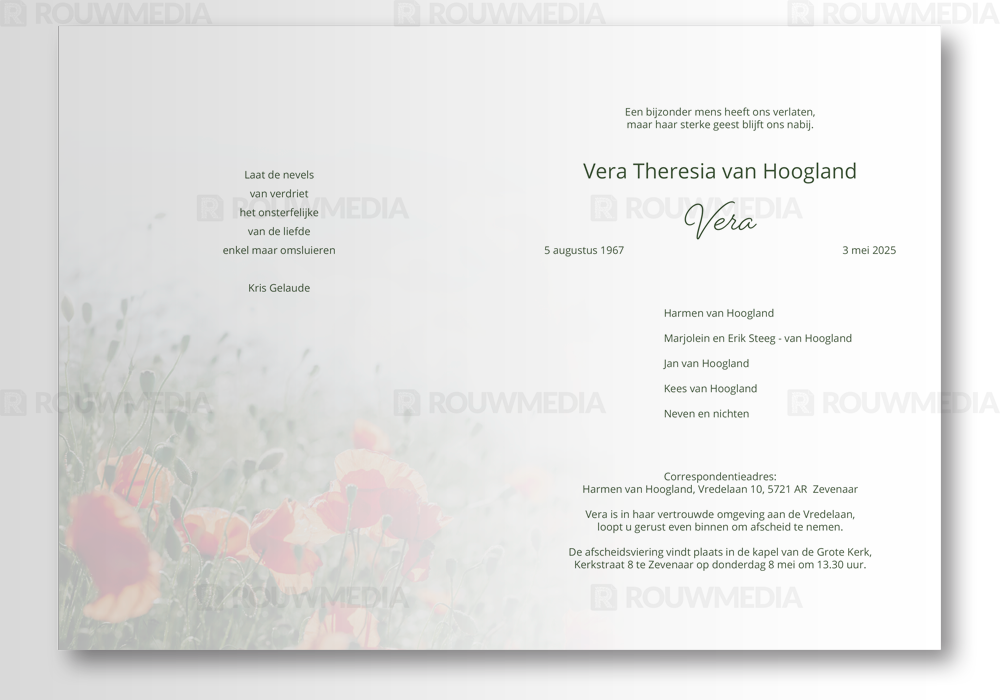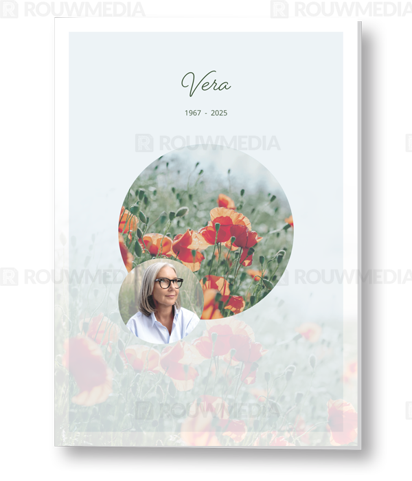 Deze staande rouwkaart toont enkele klaprozen met een portretfoto erin verwerkt.