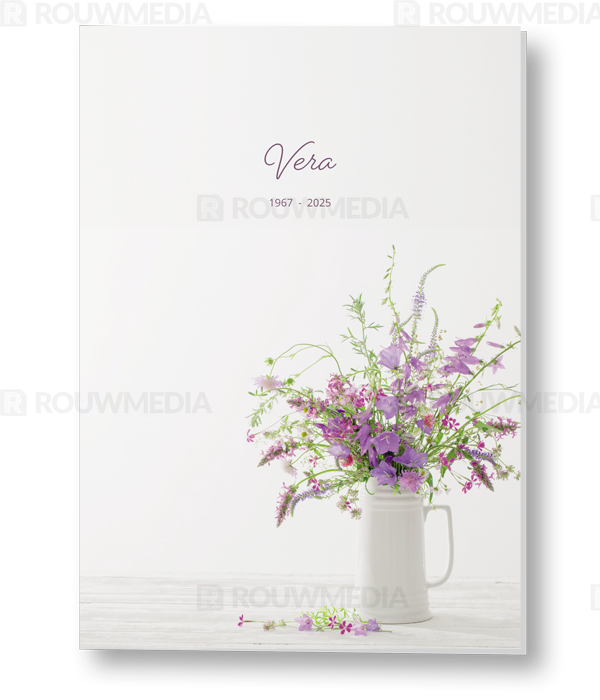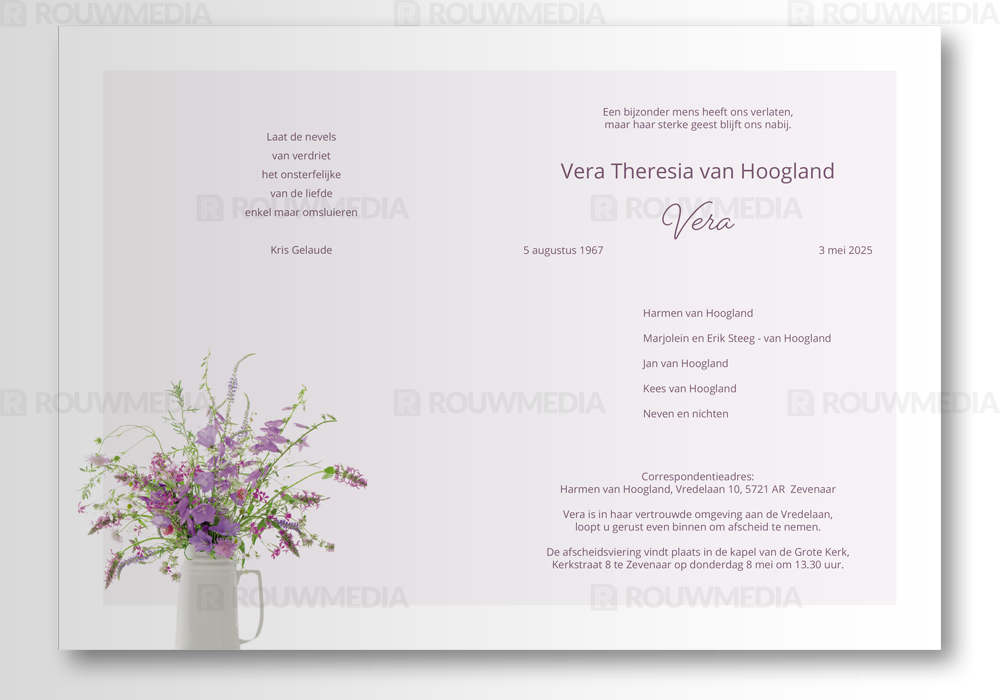 Deze staande rouwkaart toont enkele paarse veldbloemen in een vaas.
