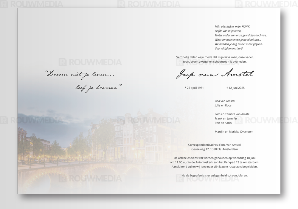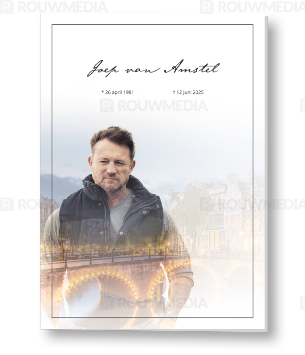 Deze staande rouwkaart toont Amsterdam met de grachtengordel op de achtergrond. Op de kaart is een portretfoto verwerkt.