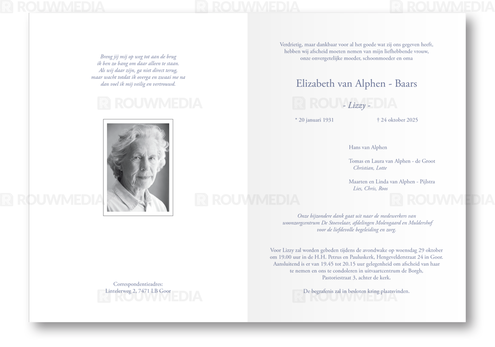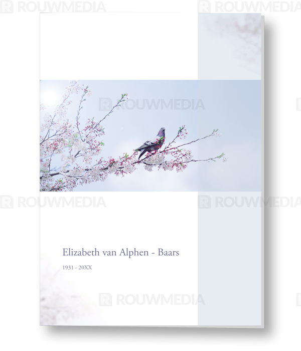 Rouwkaart met afbeelding van een duif op een bloesemtak. Aan de rechterkant wordt een transparante balk weergegeven om de kaart wat meer kleur te geven en speelser te maken.