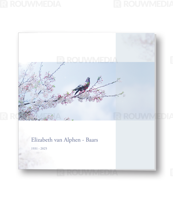 Rouwkaart met afbeelding van een duif op een bloesemtak. Aan de rechterkant wordt een transparante balk weergegeven om de kaart wat meer kleur te geven en speelser te maken.