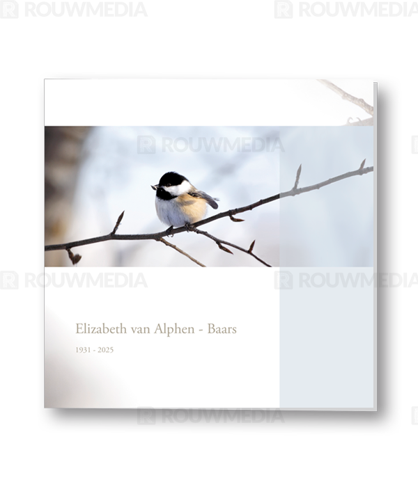 Rouwkaart met afbeelding van een koolmeesje op een tak. Aan de rechterkant wordt een transparante balk weergegeven om de kaart wat meer kleur te geven en speelser te maken.