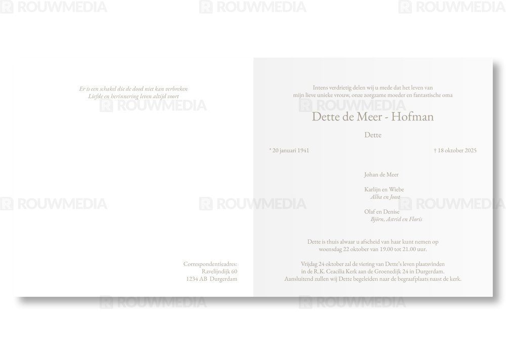 Rouwkaart met afbeelding van een koolmeesje op een tak. Aan de rechterkant wordt een transparante balk weergegeven om de kaart wat meer kleur te geven en speelser te maken.