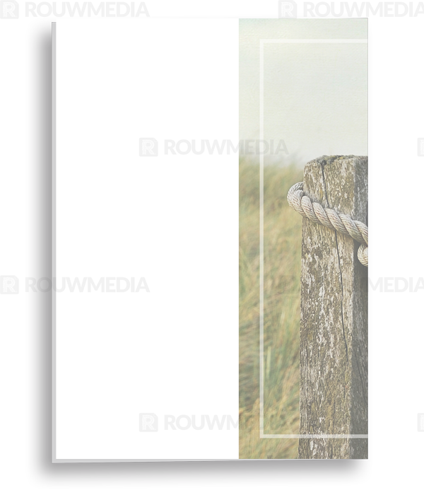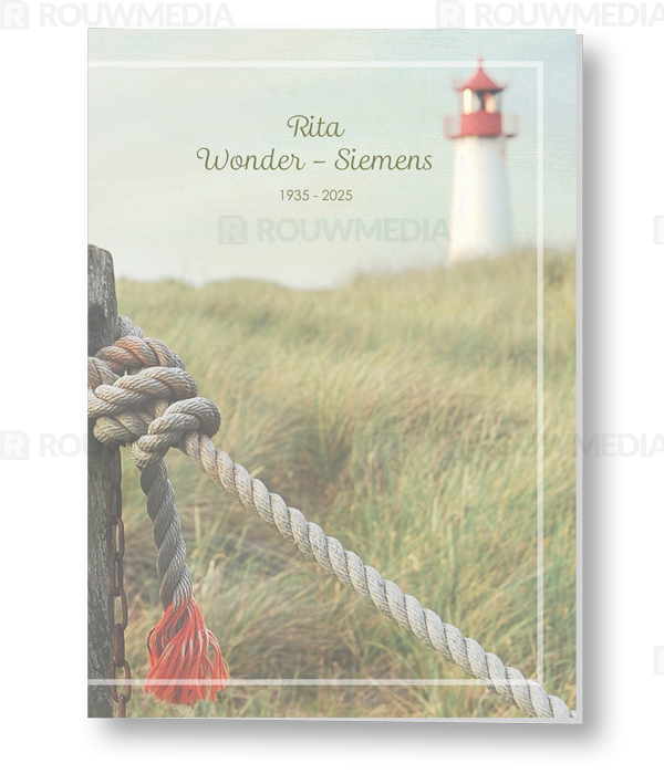 In de staande rouwkaart wordt een beeldvullende foto weergegeven van aangemeerd scheepstouw en vuurtoren op de achtergrond.