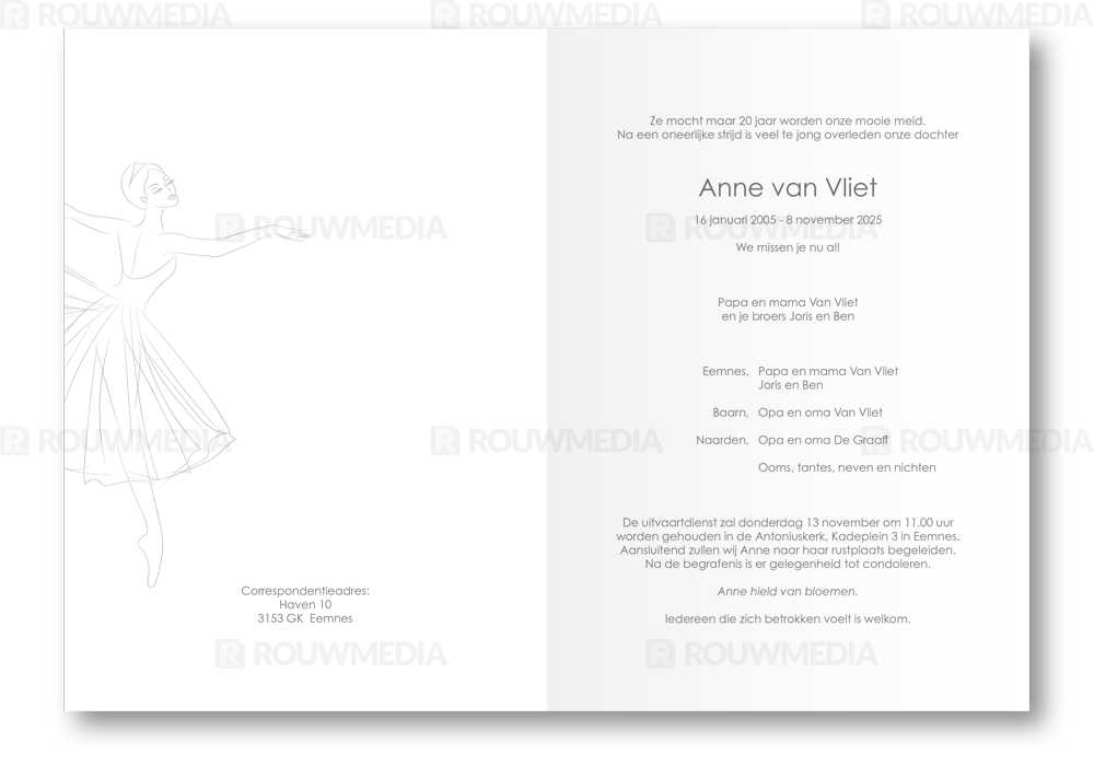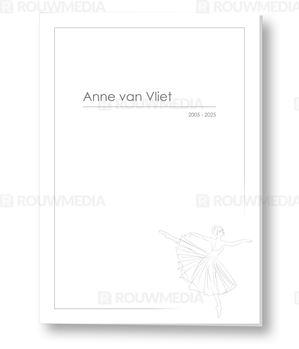 Deze rouwkaart toont in een simpele stijl hoe een afbeelding de focus kan krijgen in een kaart, maar wel de serene rust bewaart. Voor deze kaart is er gekozen voor een geïllustreerde ballerina.