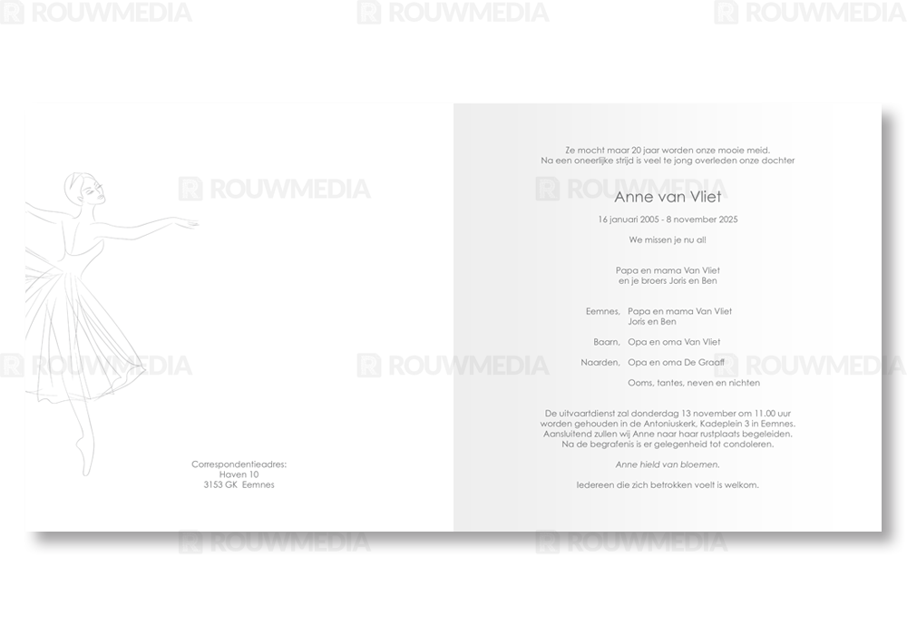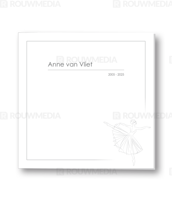 Deze vierkante rouwkaart toont in een simpele stijl hoe een afbeelding de focus kan krijgen in een kaart, maar wel de serene rust bewaart. Voor deze kaart is er gekozen voor een geïllustreerde ballerina.