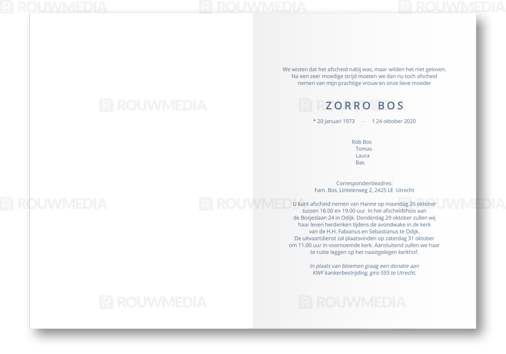 Op deze kaart wordt een roodborstje weergegeven bij de beginletter van de naam van de overledene.