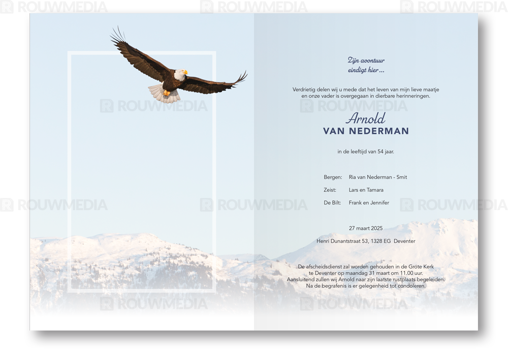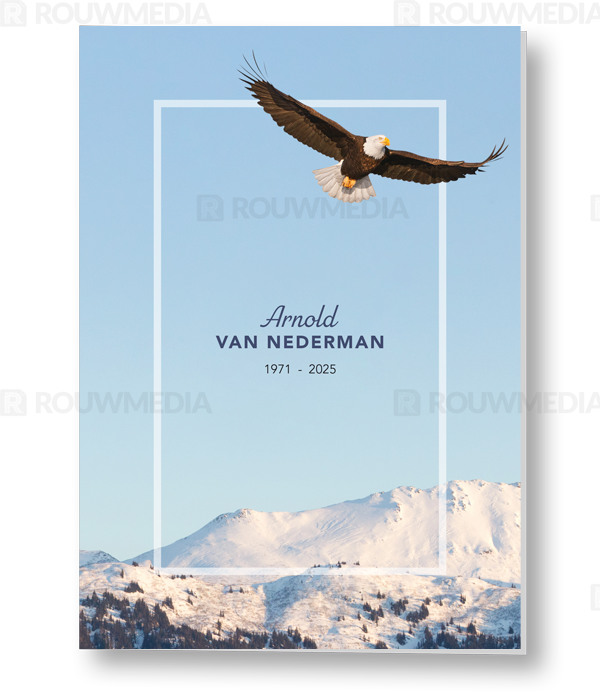 Op deze rouwkaart wordt een besneeuwd berglandschap met een Amerikaanse zeearend weergegeven en staat een stijlvol kader.