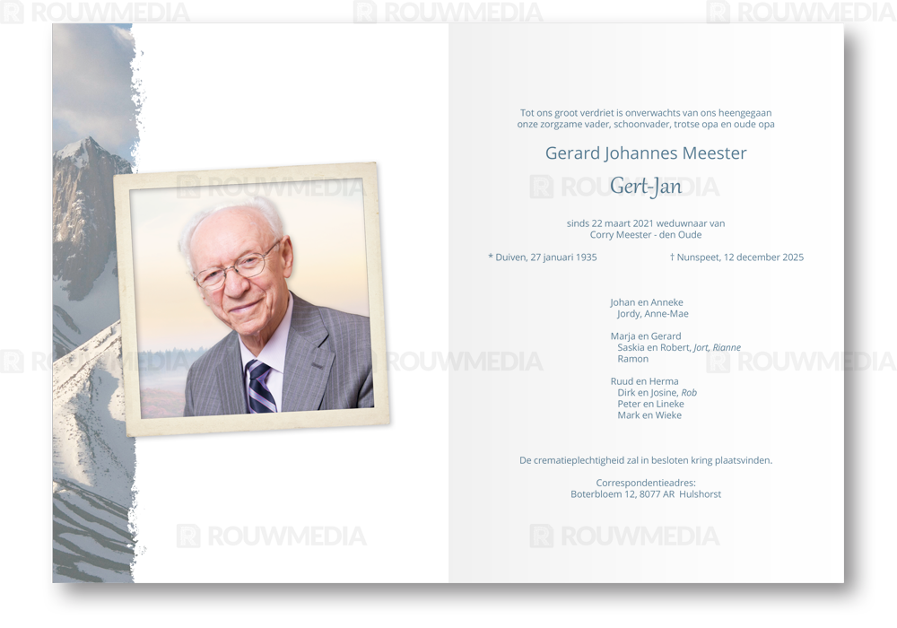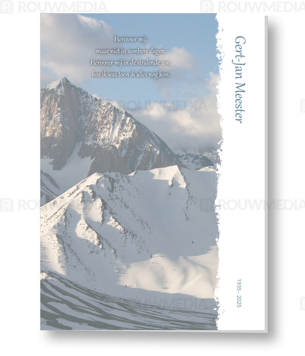 Op deze rouwkaart wordt een besneeuwd berglandschap weergegeven, aan de binnenzijde is er ruimte voor een eigen foto.