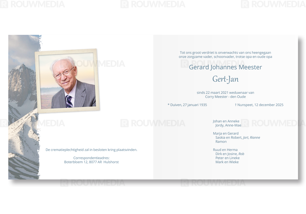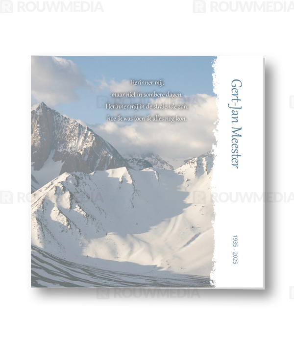 Op deze rouwkaart wordt een besneeuwd berglandschap weergegeven, aan de binnenzijde is er ruimte voor een eigen foto.