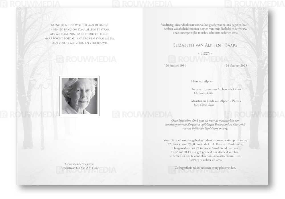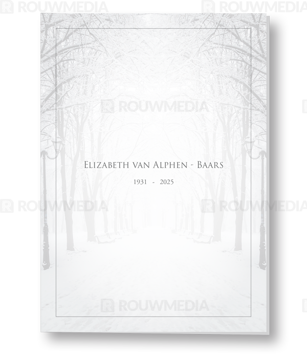 Voor deze staande rouwkaart is een dun grijs kader gebruikt. Achter dit kader is een beeldvullende afbeelding van een besneeuwd bospad weer gegeven.