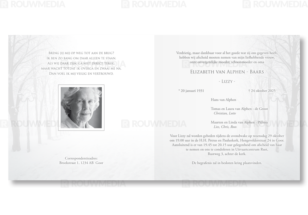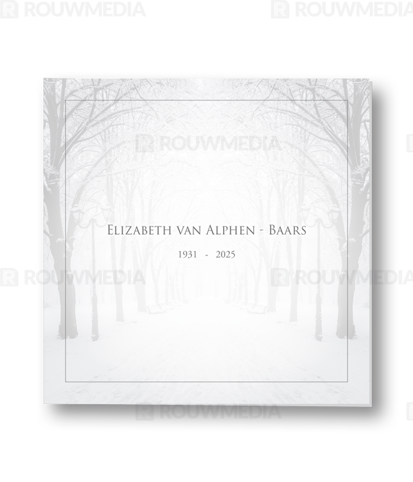 Voor deze vierkante rouwkaart is een dun grijs kader gebruikt. Achter dit kader is een beeldvullende afbeelding van een besneeuwd bospad weer gegeven.