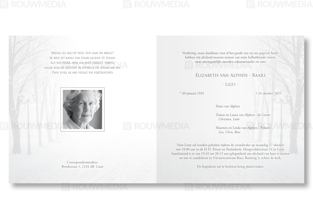 Rouwkaart met besneeuwd bospad