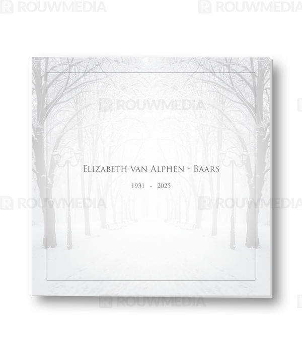 Voor deze vierkante rouwkaart is een dun grijs kader gebruikt. Achter dit kader is een beeldvullende afbeelding van een besneeuwd bospad weer gegeven.