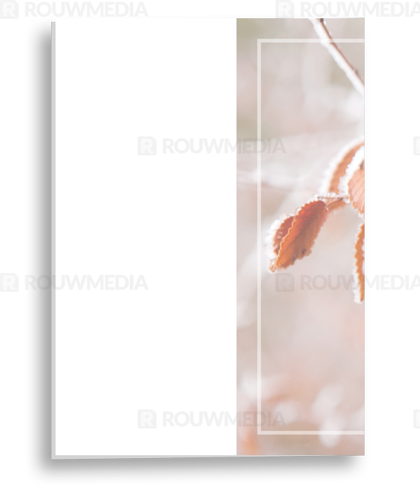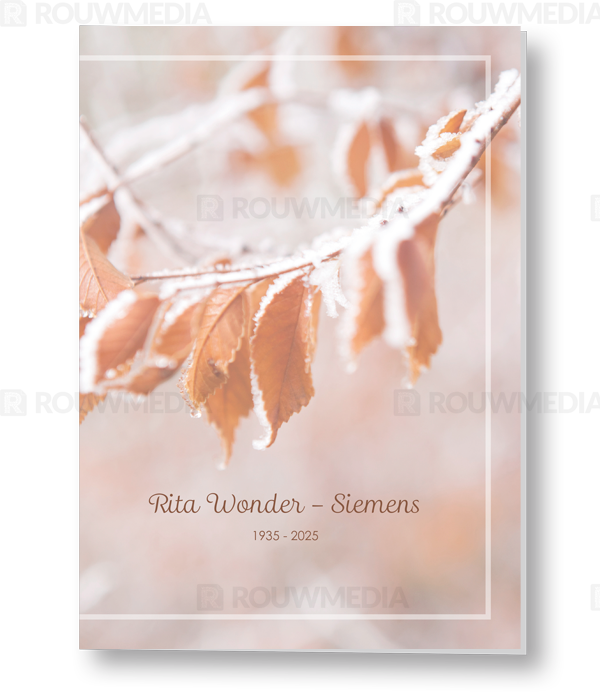 In de staande rouwkaart wordt een beeldvullende foto weergegeven van bladeren bedekt met sneeuw en ijs.