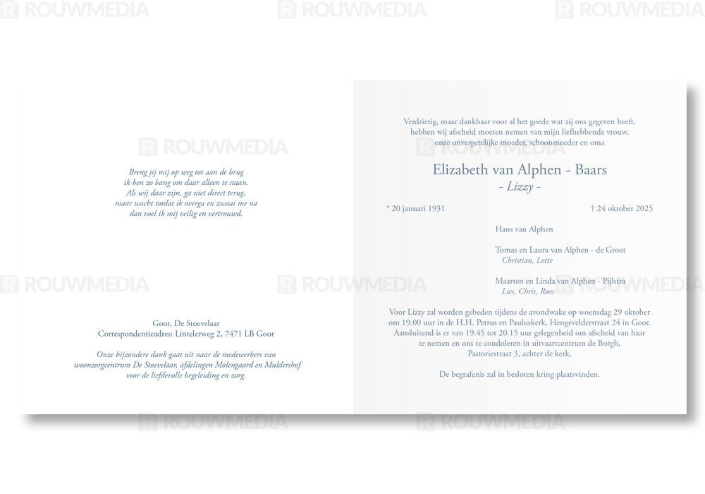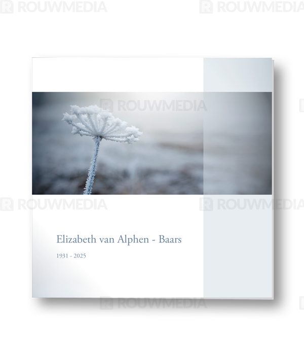 Rouwkaart met afbeelding van een bevroreren winterbloem. Aan de rechterkant wordt een transparante balk weergegeven om de kaart wat meer kleur te geven en speelser te maken.