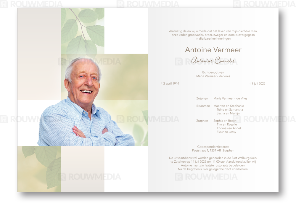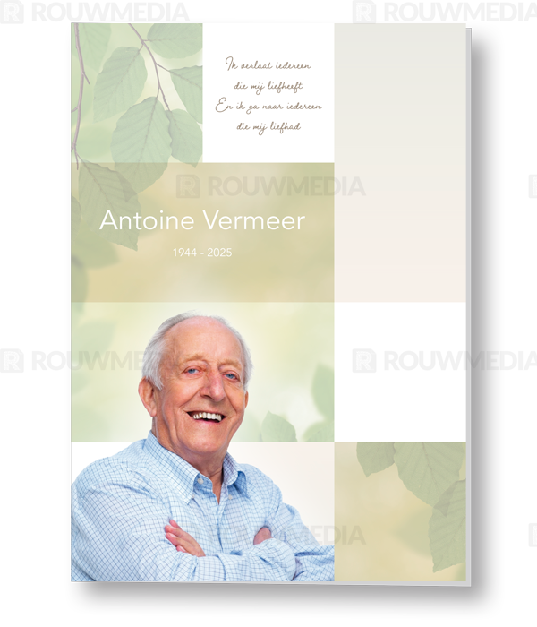 Op deze rouwkaart met vlakverdeling worden groene bladeren weergegeven en kunt u een portret plaatsen. Ook is er ruimte voor een gedicht.