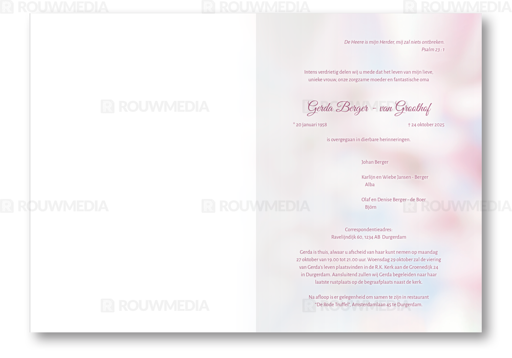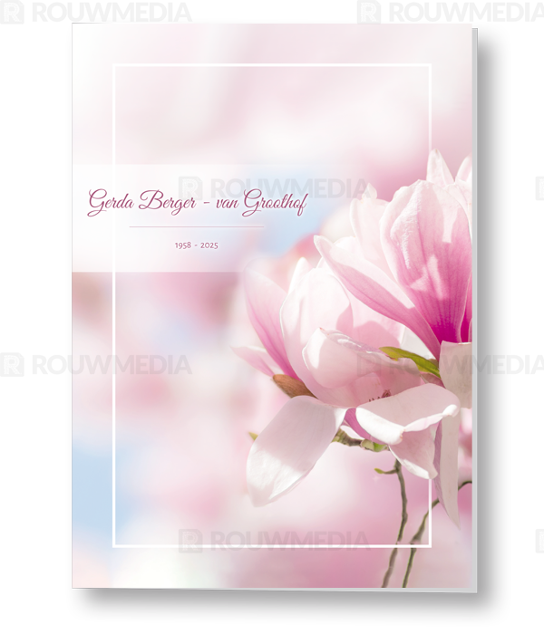 In deze recht staande kaart wordt een afbeelding weergegeven een afbeelding van een bloeiende manolia. Daarnaast is het mogelijk om de naam, data en gedicht/citaat weer te geven.