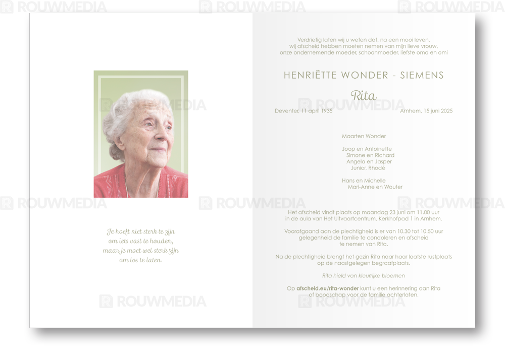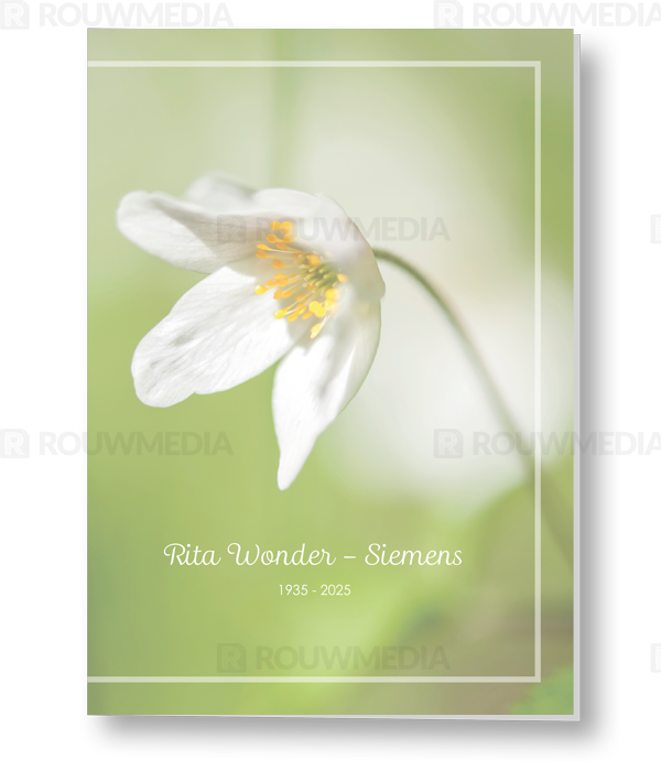 In de staande rouwkaart wordt een beeldvullende foto weergegeven van een witte bloem