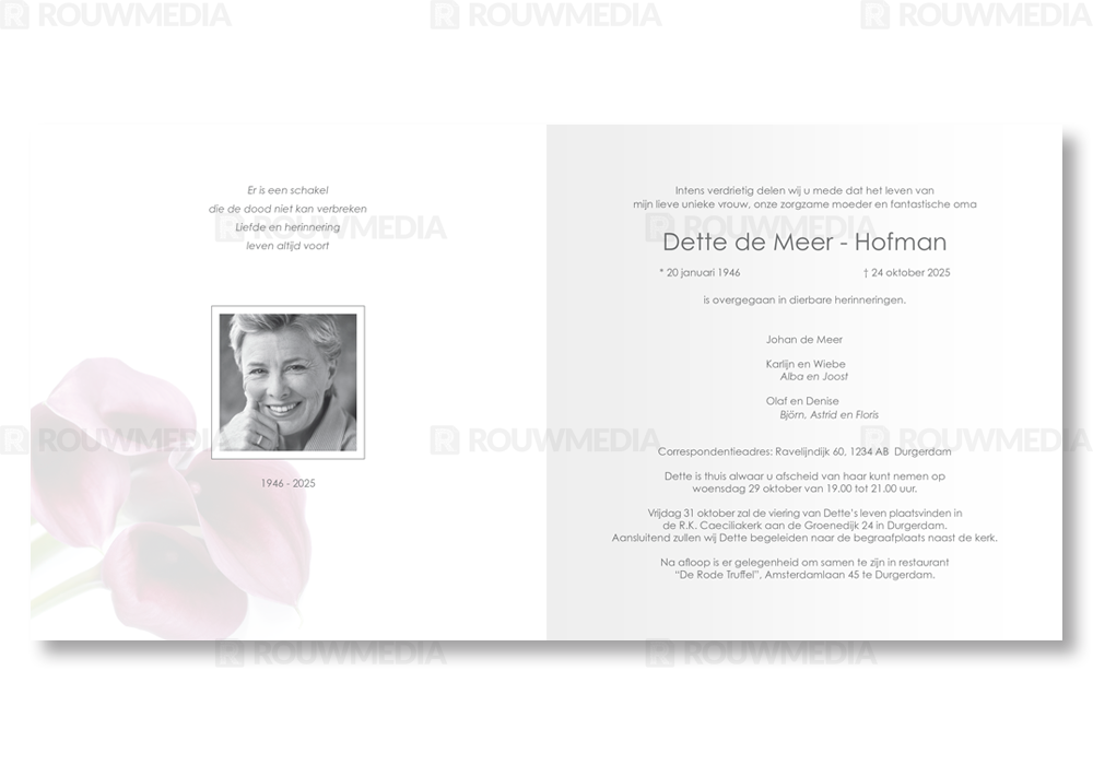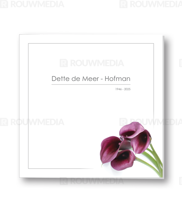 Deze vierkante rouwkaart toont in een simpele stijl hoe een afbeelding de focus kan krijgen in een kaart, maar wel de serene rust bewaart. Voor deze kaart is er gekozen voor bloemen.