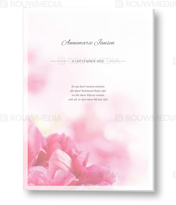 In deze staande rouwkaart wordt een beeldvullende afbeelding weergegeven van roze bloemen. Daarnaast is het mogelijk om de naam, datums en gedicht/citaat weer te geven.