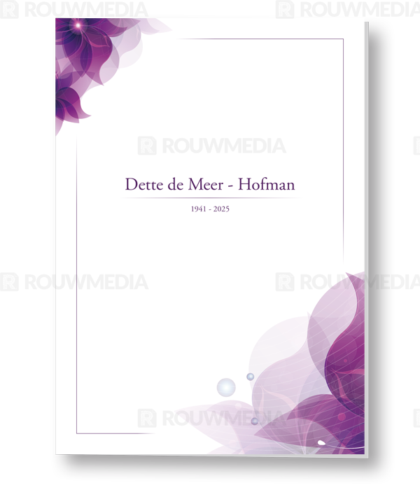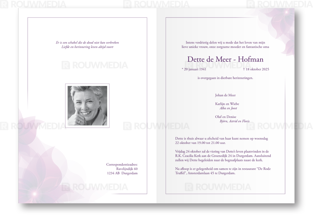 Deze rouwkaart toont in een simpele stijl hoe een afbeelding de focus kan krijgen in een kaart, maar wel de serene rust bewaart. Voor deze kaart is er gekozen voor paarse geïllustreerde bloemen.