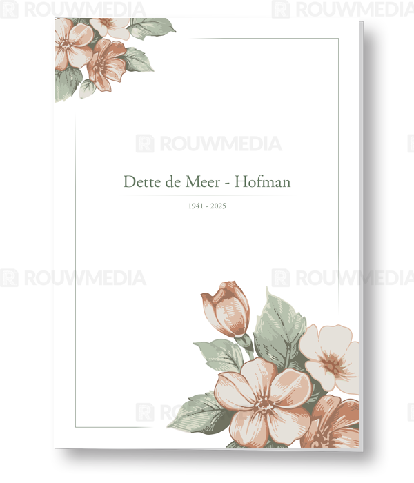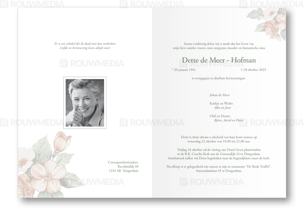 Deze rouwkaart toont in een simpele stijl hoe een afbeelding de focus kan krijgen in een kaart, maar wel de serene rust bewaart. Voor deze kaart is er gekozen voor geïllustreerde bloemen.
