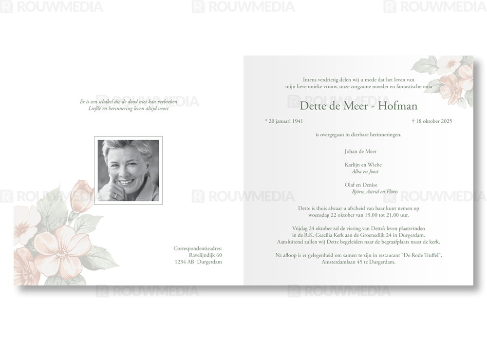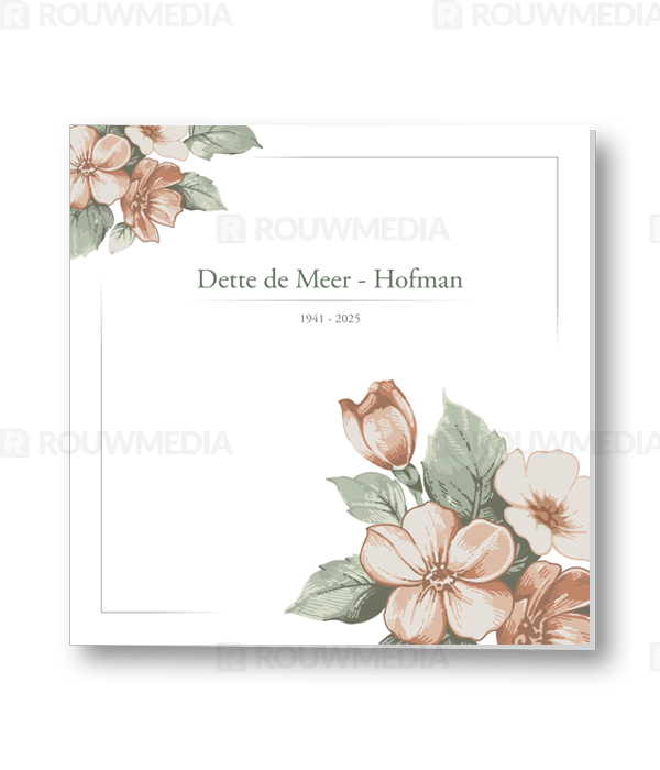 Deze vierkante rouwkaart toont in een simpele stijl hoe een afbeelding de focus kan krijgen in een kaart, maar wel de serene rust bewaart. Voor deze kaart is er gekozen voor geïllustreerde bloemen.