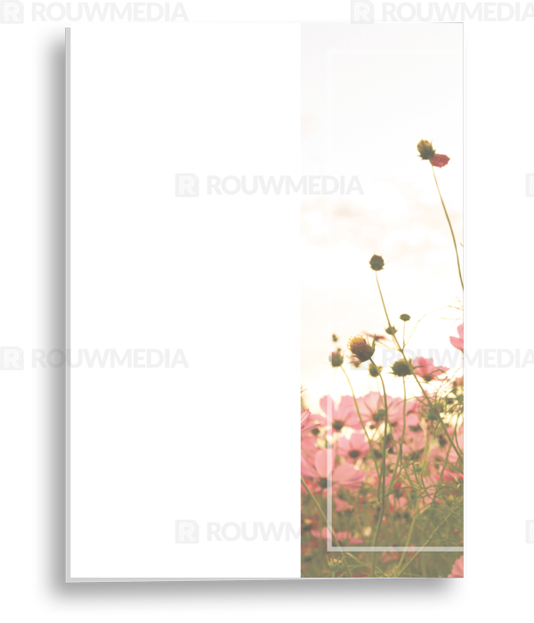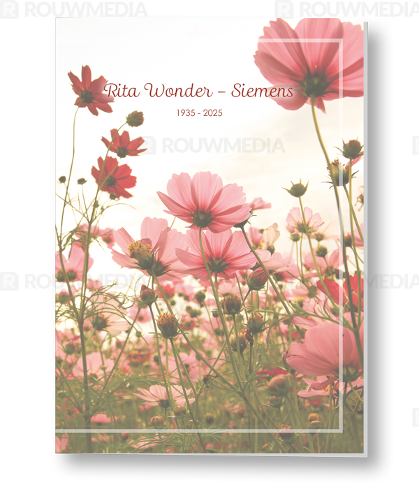 In de staande rouwkaart wordt een beeldvullende foto weergegeven van een roze bloemenveld.