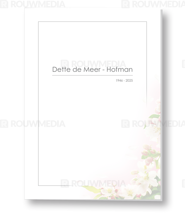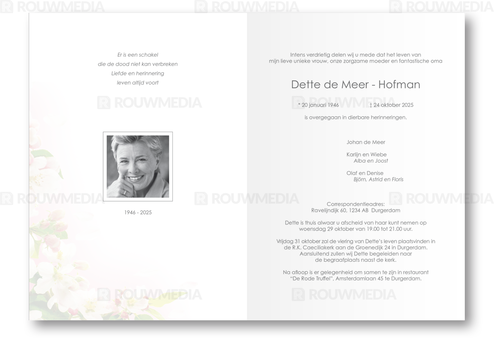 Deze rouwkaart toont in een simpele stijl hoe een afbeelding de focus kan krijgen in een kaart, maar wel de serene rust bewaart. Voor deze kaart is er gekozen voor witte bloesems.