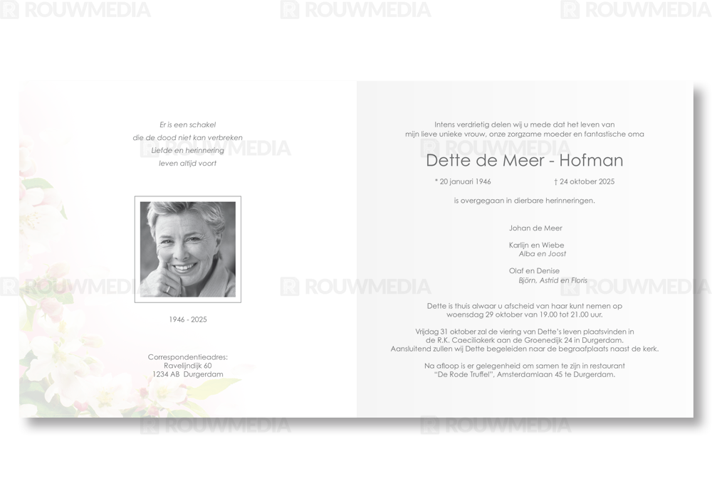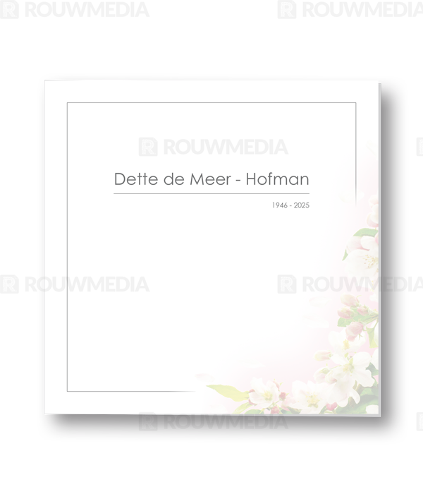 Deze vierkante rouwkaart toont in een simpele stijl hoe een afbeelding de focus kan krijgen in een kaart, maar wel de serene rust bewaart. Voor deze kaart is er gekozen voor witte bloesems.