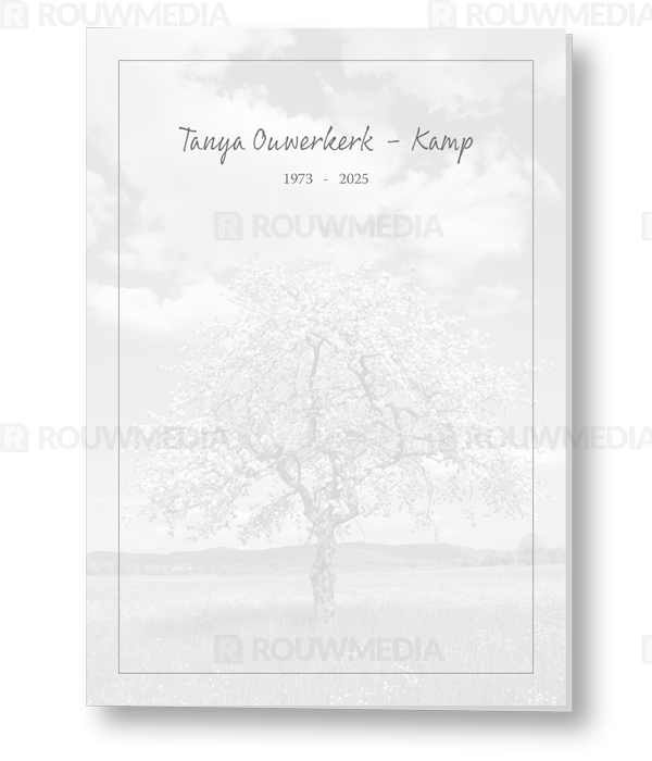 Voor deze staande rouwkaart is een dun grijs kader gebruikt. Achter dit kader is een grijze beeldvullende afbeelding van een bloesemboom weer gegeven.
