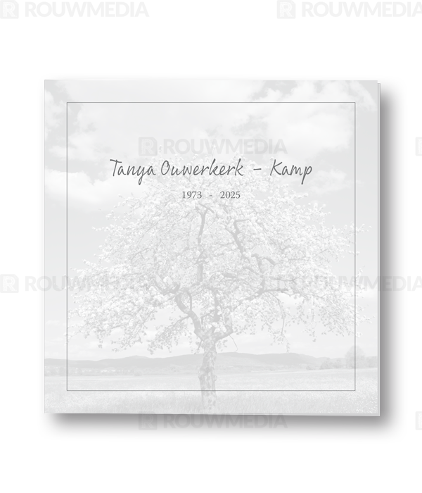 Voor deze vierkante rouwkaart is een dun grijs kader gebruikt. Achter dit kader is een grijze beeldvullende afbeelding van een bloesemboom weer gegeven.