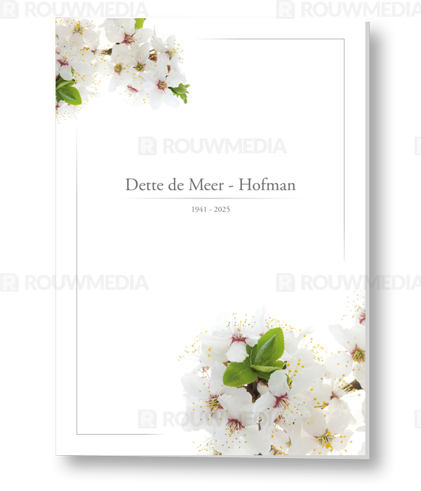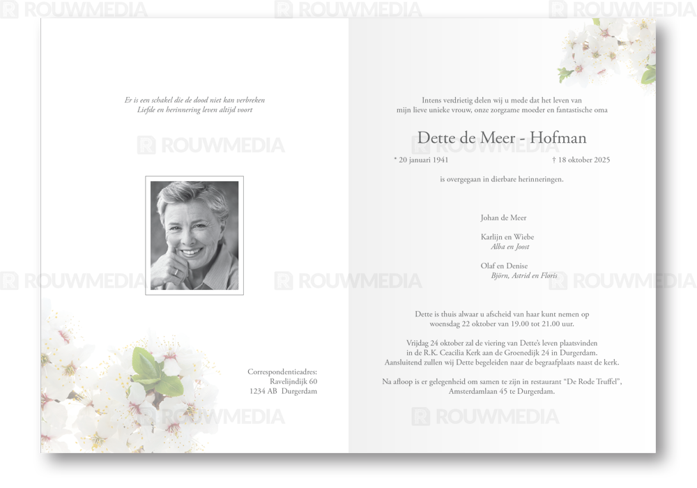 Deze staande rouwkaart toont in een simpele stijl hoe een afbeelding de focus kan krijgen in een kaart, maar wel de serene rust bewaart. Voor deze kaart is er gekozen voor witte bloesems.