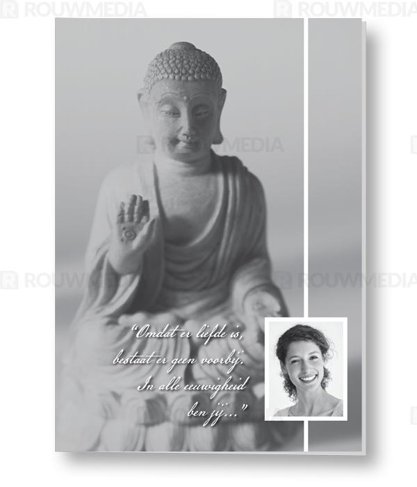 In deze staande rouwkaart wordt een beeldvullende grijze afbeelding weergegeven van een boeddha beeld. Daarnaast is het mogelijk om een foto/portret en gedicht/citaat weer te geven.