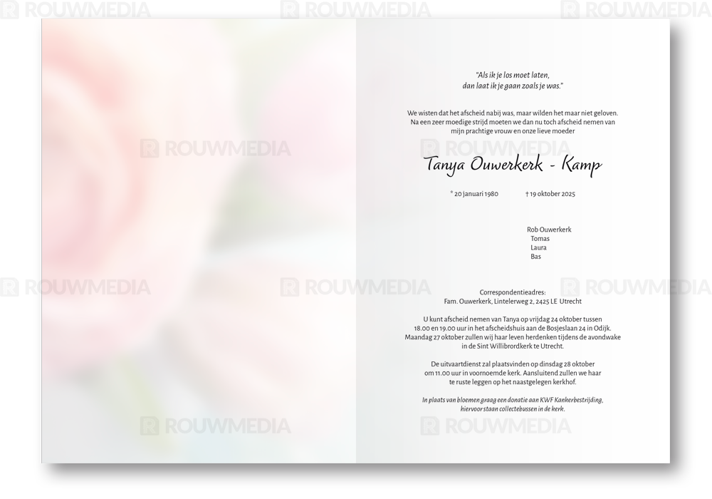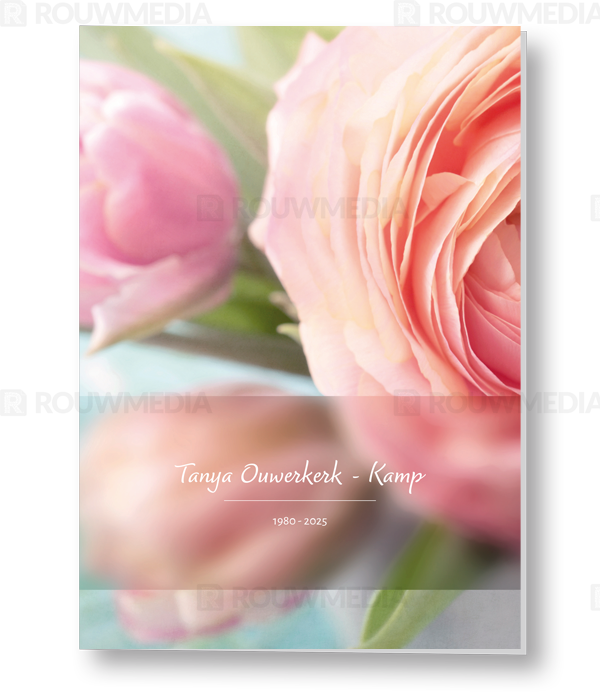 In deze staande rouwkaart wordt een beeldvullende afbeelding weergegeven die geïnspireerd is op de natuur. Over deze afbeelding is een wazige balk geplaatst zodat er ruimte ontstaat om een naam met datum weer te geven.