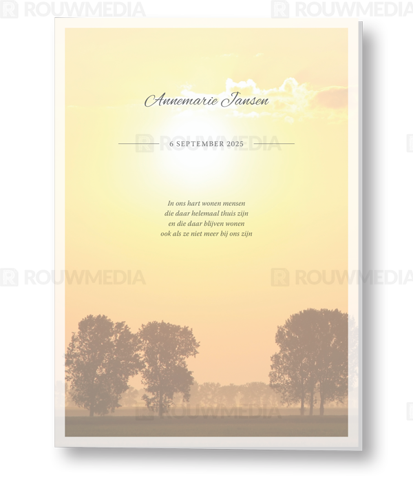 In deze staande rouwkaart wordt een beeldvullende afbeelding weergegeven van bomen in het weiland. Daarnaast is het mogelijk om de naam, datums en gedicht/citaat weer te geven.
