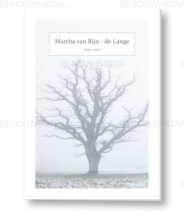 In de staande rouwkaart wordt een beeldvullende foto weergegeven van een boom in een winterslandschap.
